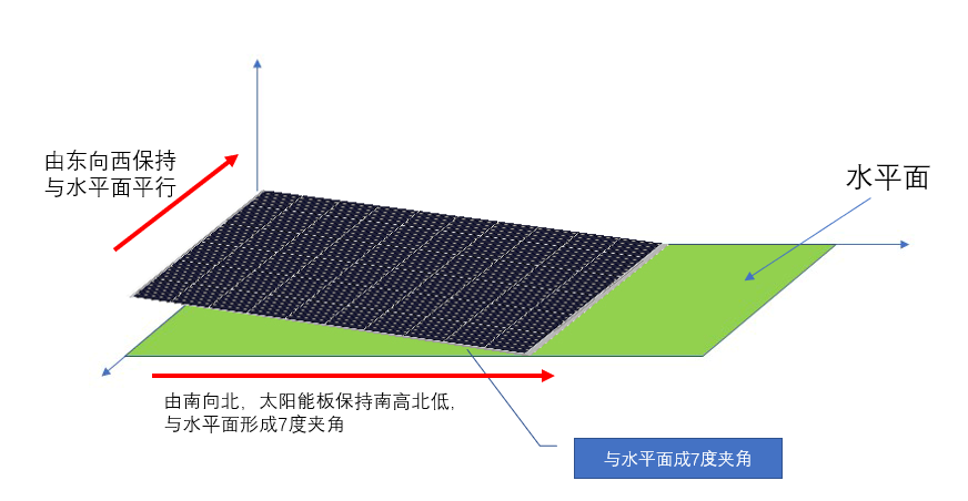 太陽(yáng)能板的安裝需要有正確的安裝角度。達(dá)累斯薩拉姆的南緯7°,這表示在我們安裝太陽(yáng)能的時(shí)候,首先,太陽(yáng)能板的平面需要向北方傾斜7°,使太陽(yáng)能板與水平面形成7°夾角。示意圖如下:
